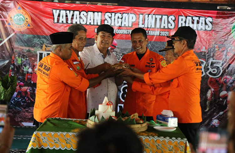 Puncak acara ditandai dengan prosesi pemotongan tumpeng oleh Bupati Agung Setyawan yang diserahkan langsung kepada Ketua Umum Yayasan SAR SiGAP Lintas Batas.